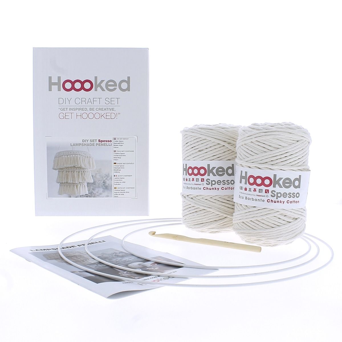 Dieser Lampenschirm mit flauschigen Fransen sieht wie eine Makramé Lampe aus, ist aber gehäkelt. Die Hängelampe besteht aus drei Etagen und strahlt dezente Gemütlichkeit aus. Der Lampenschirm wurde mit Hoooked Spesso Chunky Cotton angefertigt, einem super weichen recycelten Baumwollgarn, das man zu sehr flauschigen Fransen auskämmen kann um einen schönen Boho Touch zu kreieren. Die Farbe Almond ist dezent und der natürliche Elfenbeinton passt zu jeder Einrichtung. Sie häkeln diesen Lampenschirm um drei Metallringe. Das Häkelmuster zur Penelli Lampe wurde von Studio Belovely entworfen und steht für eine gute Anleitung, mit der Sie viel Saß beim Häkeln haben werden. Am Ende dieses Projektes halten Sie einen wunderschönen Lampenschirm in Ihren Händen. Wir raten Ihnen in diesen Lampenschirm keine Glühbirne einzusetzen , sondern LED Licht. Dies ist nicht nur umweltfreundlicher, sondern auch komplett feuersicher.