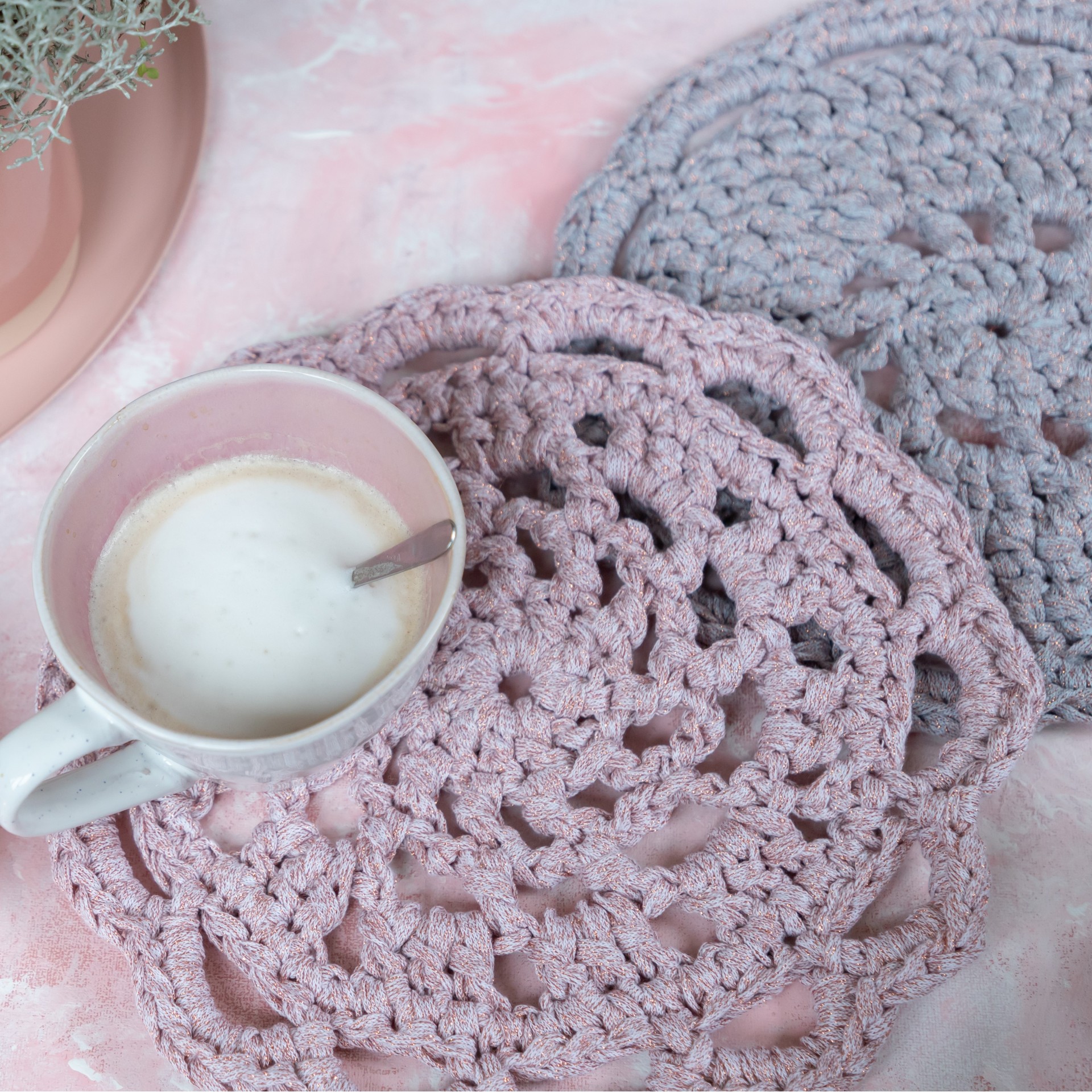 Dekorieren Sie Ihren festlich geschmückten Tisch mit funkelnden Häkelplatzdeckchen aus RibbonXL Lurex-Garn. Laden Sie sich einfach die kostenlose Vorlage für ein gehäkeltes Platzdeckchen herunter, holen Sie sich super dicke RibbonXL Lurex-Wolle und schon kann es losgehen! Wenn Sie bereits erste Häkelerfahrungen gesammelt haben, lässt sich dieses kostenlose Muster leicht häkeln. Das funkelnde Lurex-Garn verleiht Ihrer DIY-Deko zu Hause eine festliche Note.
