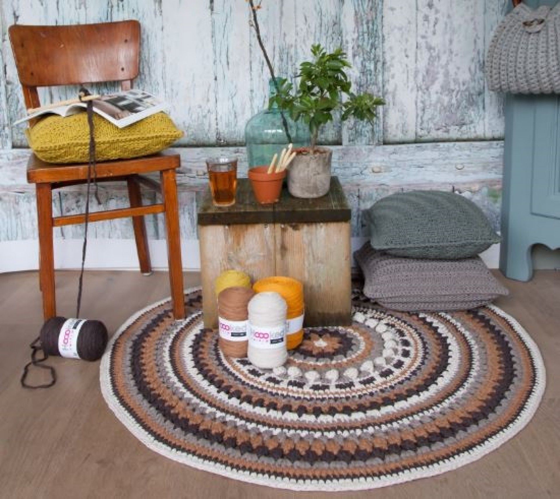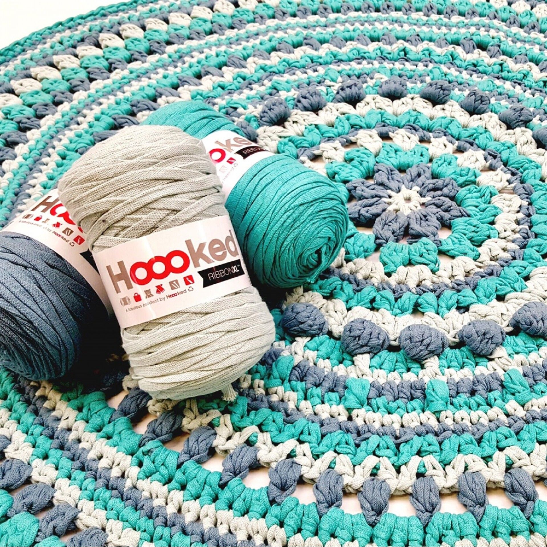 Häkeln Sie den Teppich mit Megamaschen, einfach und schnell anhand der Anleitung von Hoooked und Marit Parit.