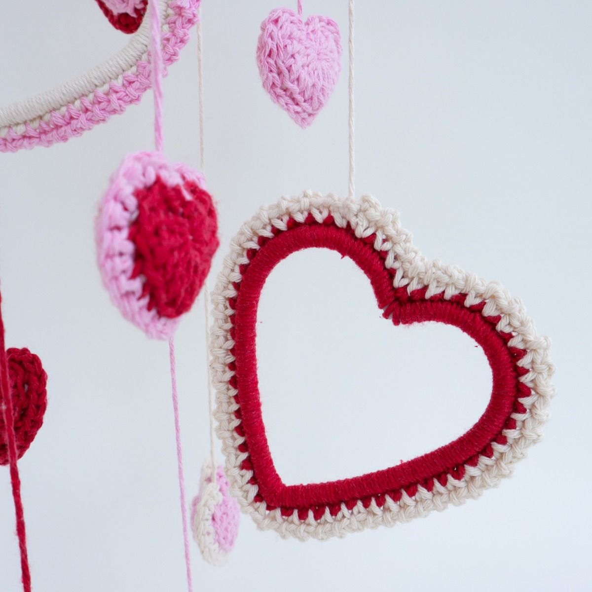 Das DIY Häkelmobil ist für die wahren Kreativen! Dieser Häkel-Traumfänger mit Herzformen ist ein echter Hingucker. Wenn Sie es in das Kinderzimmer oder in Ihr eigenes Schlafzimmer hängen, wird es immer seine Freude erstrahlen! Neben Häkelfähigkeiten erfordert dieses Babymobil auch andere handwerkliche Fähigkeiten wie Messen, Basteln und Nähen. Das heart mobile wurde von Studio Hedwig entworfen und mit Eco Barbante aus unseren recycelten PET-Rahmen hergestellt. Eco Barbante ist ein weiches und robustes recyceltes Baumwollgarn mit einer schönen Farbpalette. Unsere Farbkombinationen zeigen schöne Kombinationen von Hell-, Pastell- und Neutraltönen. Aber natürlich können Sie auch Ihre eigene Farbkombination erstellen! Dieses DIY-Handy ist perfekt für die Dekoration, aber es ist nicht als Spielzeug gedacht. Stellen Sie also sicher, dass Sie es außerhalb der Reichweite Ihres Kindes aufhängen.